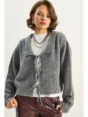 Bianco Lucci Füme Yakalı Bağlama Detaylı Triko Hırka