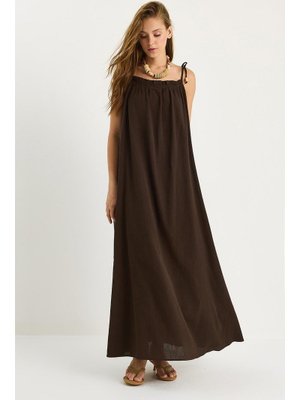 Bianco Lucci Acı Kahve Bağlama Askılı Cep Detaylı Astarlı Uzun Krinkıl Oversize Elbise
