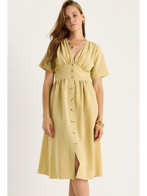 Bianco Lucci Safran V Yaka Bel Detaylı Düğmeli Kısa Kollu Viskon Keten Elbise