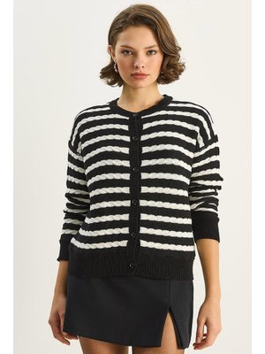 Bianco Lucci Beyaz Çizgili Saç Örgü Basic Triko Hırka Siyah