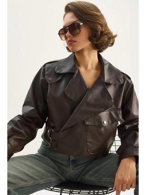 Bianco Lucci Acı Kahve Geniş Cep Detaylı Kemerli Oversize Crop Deri Ceket