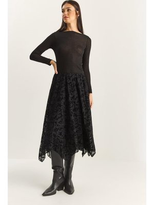 Bianco Lucci Siyah Kadife Desenli Astarlı Asimetrik Kesim Beli Lastikli Midi Etek