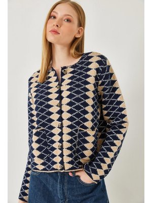 Bianco Lucci Lacivert Bej Yan Baklava Desenli Triko Hırka