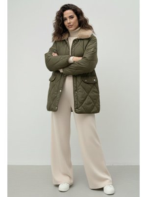 Benguen Haki Yakası Kürklü Kapitone Mont