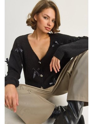 Bianco Lucci Siyah Fiyonk Aksesuarlı V Yaka Oversize Düğmeli Hırka