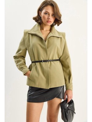 Bianco Lucci Çağla Yeşili Strüktürlü Omuz Detaylı Kemerli Astarlı Ceket