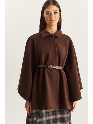 Bianco Lucci Kahverengi Yakalı Tek Düğme Detaylı Kemerli Kaşe Panço