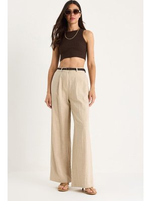 Bianco Lucci Bej Hasır Kemerli Cep Detaylı Çımalı Keten Palazzo Pantolon