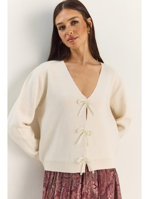 Bianco Lucci Krem İncili Fiyonk Aksesuarlı V Yaka Triko Hırka