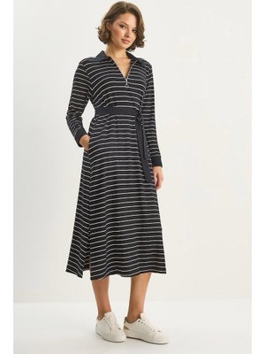Bianco Lucci Siyah Beyaz Kuşaklı Cep Detaylı Yakası Fermuarlı Çizgili Uzun Basic Elbise