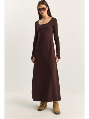 Bianco Lucci Acı Kahve Uzun Kollu U Yaka Relaxed Elbise