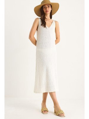 Bianco Lucci Ekru V Yaka Askılı Yazlık Triko Elbise