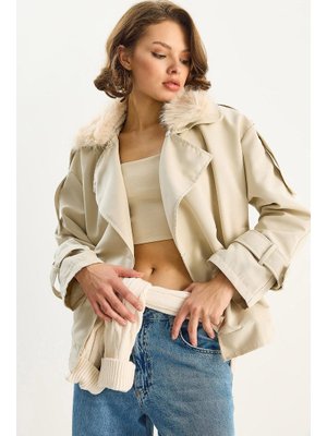 Bianco Lucci Taş Beli Lastikli Cep Detaylı Çıkarılabilir Kürk Yaka Astarlı Kısa Trençkot