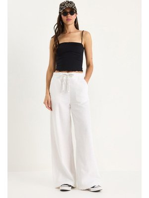 Bianco Lucci Beyaz Beli Lastikli Cep Detaylı Keten Palazzo Pantolon