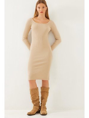 Bianco Lucci Bej Kare Yaka Uzun Kollu Basic Fitilli Elbise
