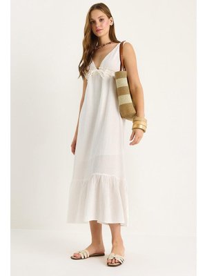 Bianco Lucci Beyaz V Yaka Bağlama Detaylı Astarlı Müslin Elbise