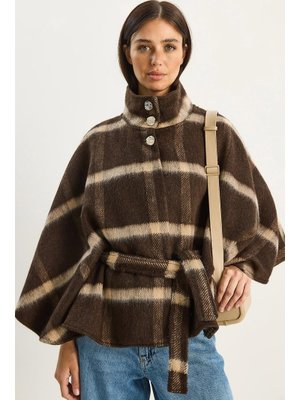 Bianco Lucci Acı Kahve Ekose Desneli Kuşaklı Düğme Detaylı Kaşe Panço