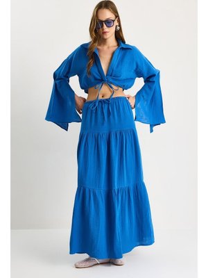 Bianco Lucci Mavi Bağlama Detaylı Yırtmaçlı Geniş Kol Bluz Astarlı Uzun Etek Takım