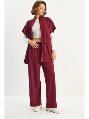 Bianco Lucci Bordo Beli Lastikli Büyük Cep Detaylı Yelek Bol Pantolon Alt Üst Modal Takım