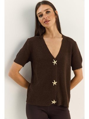 Bianco Lucci Kahverengi Deniz Yıldızı Aksesuarlı Pirinç Örgü Kısa Kollu Triko Hırka
