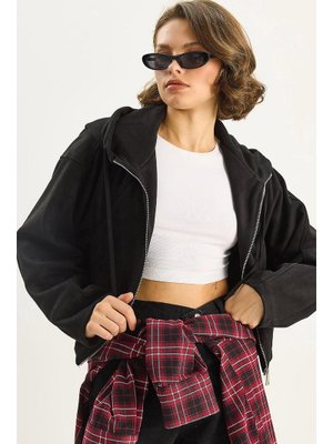 Bianco Lucci Siyah Kapüşonlu Fermuarlı Cep Detaylı Astarlı Süet Bomber Ceket