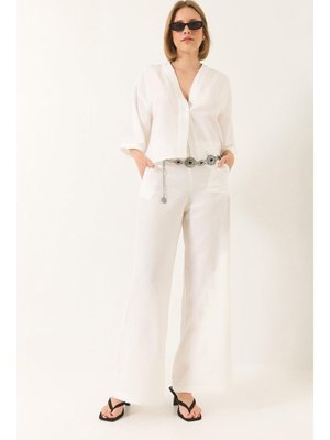 Bianco Lucci Beyaz V Yaka Yarasa Kol Keten Kimono Palazzo Pantolonlu Alt Üst Takım