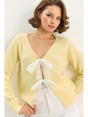 Bianco Lucci Sarı V Yaka Fiyonk Aksesuar Kapamalı Triko Hırka
