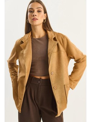 Bianco Lucci Camel Cep Detaylı Kuşaklı Süet Ceket