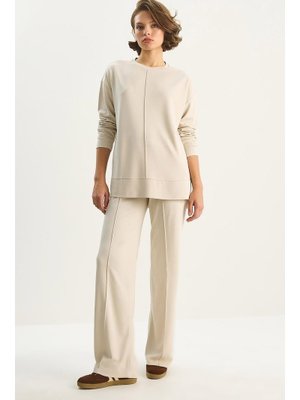 Bianco Lucci Açık Bej Bisiklet Yaka Uzun Kollu Üst Nervürlü Beli Lastikli Bol Pantolon Modal Takım