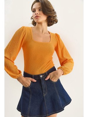 Bianco Lucci Turuncu Kare Yaka Uzun Kollu Gofre Bluz
