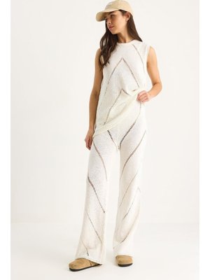 Bianco Lucci Ekru Kalın Askılı Bluz Bol Pantolonlu İnce Yazlık Triko Alt Üst Takım