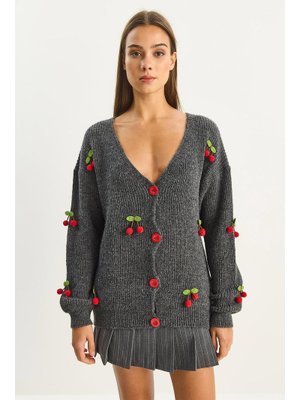 Bianco Lucci Antrasit V Yaka Kiraz Aksesuarlı Triko Hırka