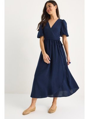 Bianco Lucci Lacivert Kruvaze Kapamalı Balon Kollu Uzun Müslin Elbise