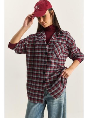 Bianco Lucci Kırmızı Beyaz Tek Cep Detaylı Oversize Ekose Gömlek