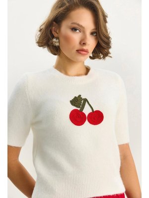 Bianco Lucci Beyaz Bisiklet Yaka Kısa Kollu Kiraz Örgü Nakış İşlemeli Triko Bluz