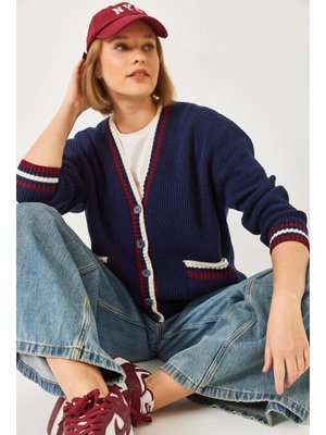 Bianco Lucci Lacivert Çizgili Selanik Örgülü Triko Hırka