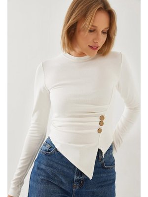Bianco Lucci Beyaz Düğme Desenli Asimetrik Kesim Bluz