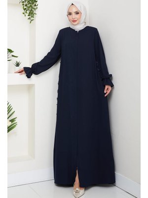 Hafsa Mina Lacivert Kolları Volanlı Çiçek Detaylı Ferace