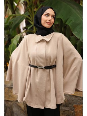 İmaj Butik Koyu Bej Kemerli Kaşe Panço