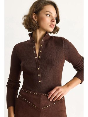 Bianco Lucci Acı Kahve Çıtçıtlı Fitilli Dik Yaka Uzun Kollu Basic Triko Bluz