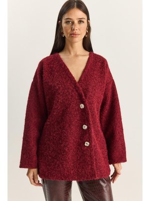 Bianco Lucci Bordo V Yaka Şık Asimetrik Düğmeli Kırçıllı Kaşe Hırka