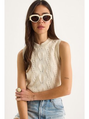 Bianco Lucci Ekru Örgü Detaylı Basic Kolsuz Triko Bluz