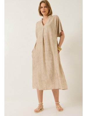 Bianco Lucci Bej V Yaka Bağlama Detaylı Cepli Yarasa Kesim Salaş Elbise