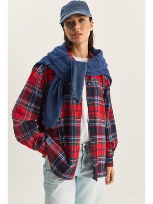 Bianco Lucci Lacivert Ekose Desenli Oversize Oduncu Gömlek Kırmızı