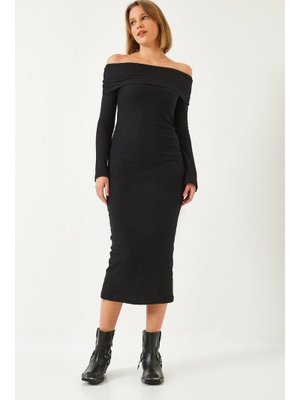 Bianco Lucci Siyah Madonna Yaka İspanyol Kol Fitilli Elbise
