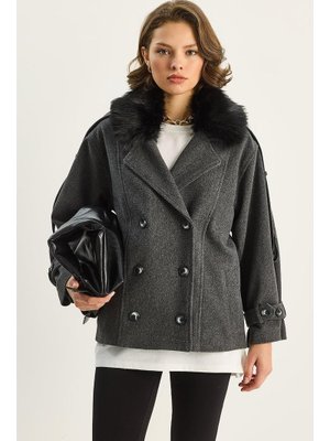 Bianco Lucci Antrasit Seyyar Kürk Yaka Apoletli Cep Detaylı Astarlı Kaşe Kaban