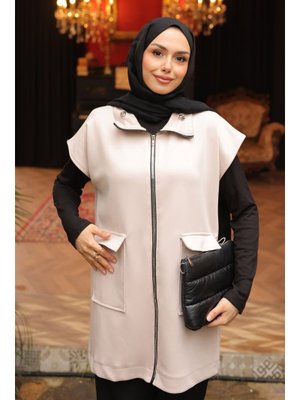 İmaj Butik Bej Yakası Ve Beli Stoper Lastikli Cepli Scuba Yelek