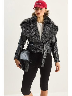 Bianco Lucci Siyah Kürk Yaka Kuşaklı Astarlı Suni Deri Ceket