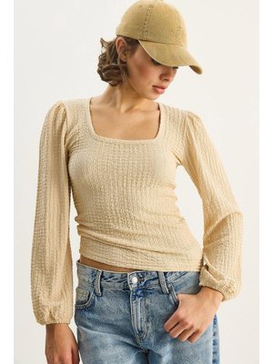 Bianco Lucci Bisküvi Kare Yaka Uzun Kollu Gofre Bluz