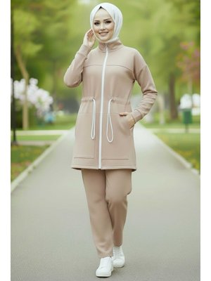 Tofisa Krem Belde Lastik Detaylı Fermuarlı Cepli Modal İkili Takım